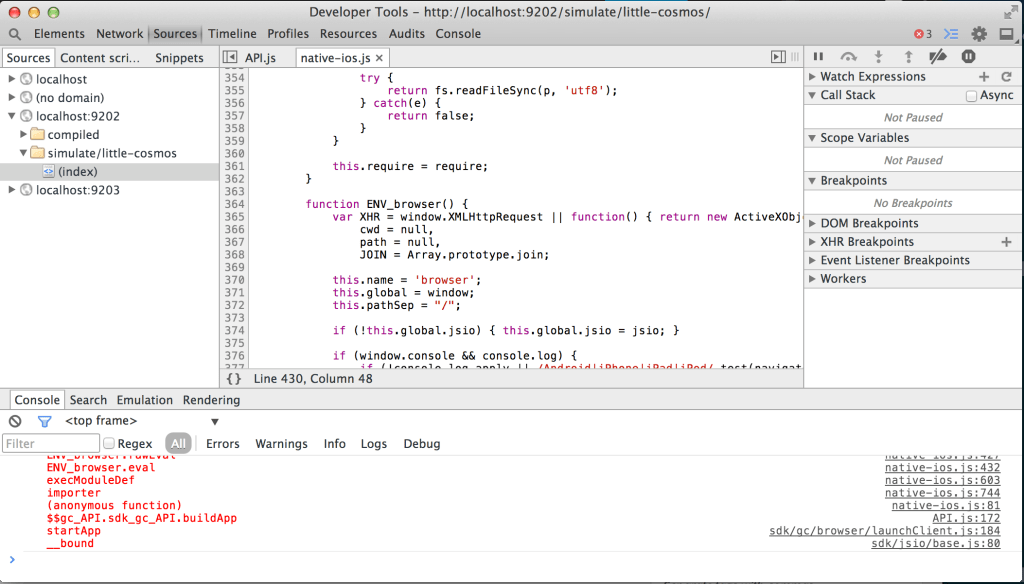 It was super easy to get started (hey! a simulator in the browser! — contrast that with a completely non-working emulator for Android). But very soon I ran into (what seemed like) a huge problem — how the $#% was I supposed to debug anything here?