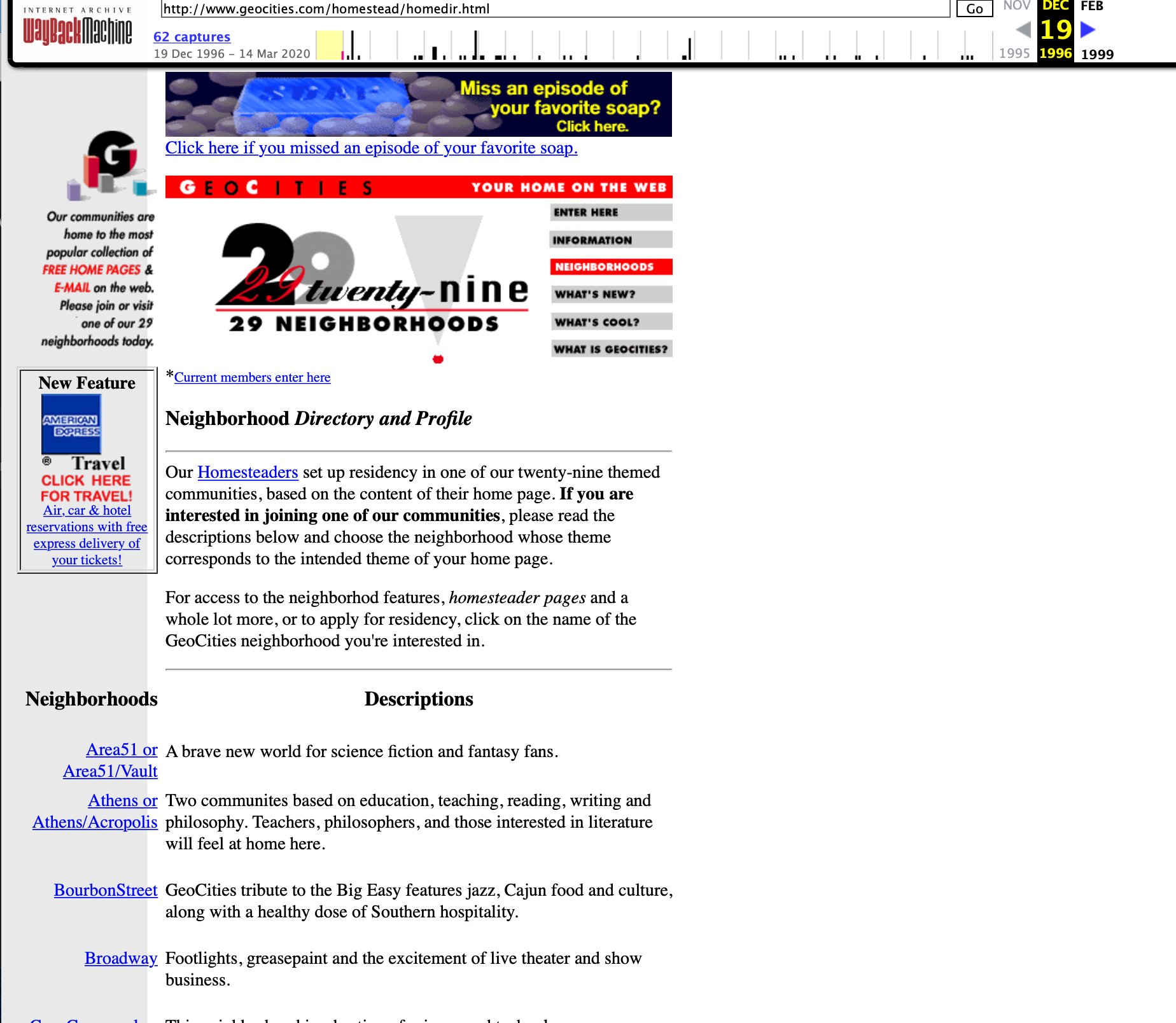 Ooh, Geocities, such a 90s thing. A utopian take on having different tribes and communities(there was already such a diverse bunch) have clusters of home pages.