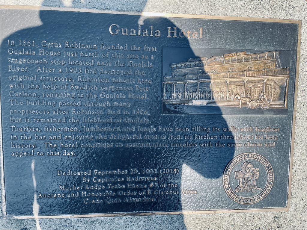 We were staying at Gualala, and were eating at Upper Crust Pizzeria, which was really good, and so we returned to it. Next to it was the “Gualala Hotel”. This plaque was in front of it.