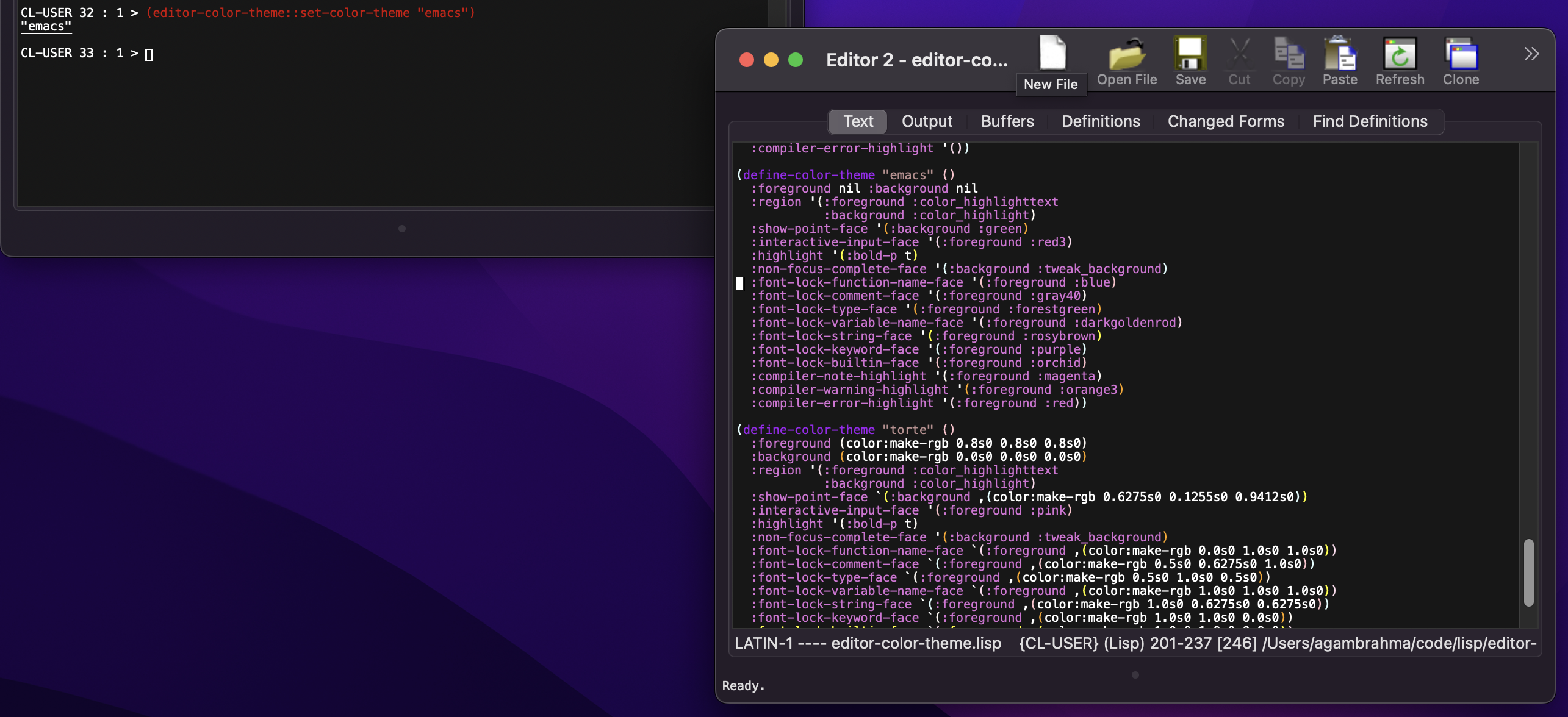 Setting color themes in LispWorks