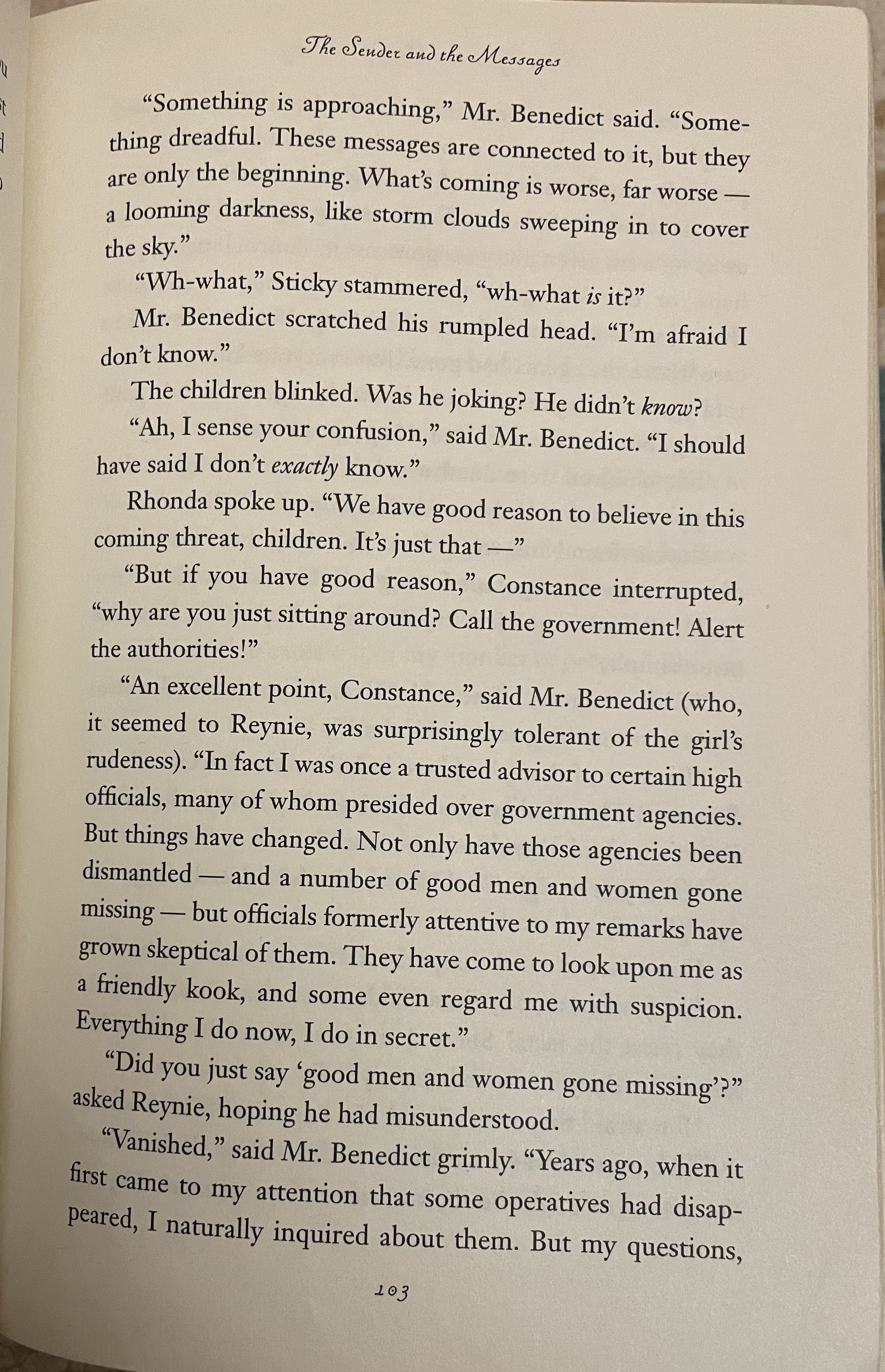 Recently started reading “The Mysterious Benedict Society” with my daughter (after the show on Disney), and … it has some interesting parts.