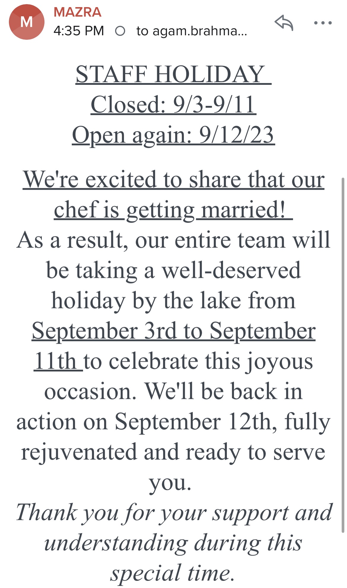 Taking breaks September 1, 2023 by Agam Brahma Uncategorized I throughly approve of this way to run a restaurant 😊