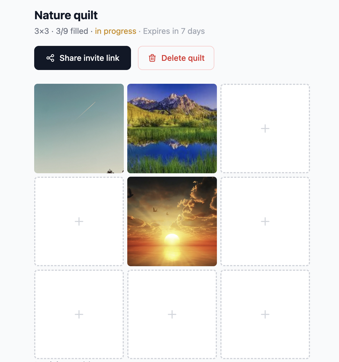 That's Patchwork. You create a quilt: pick a title, choose a grid size (3×3 to 5×5), share an invite link, and collaborators claim and fill squares asynchronously at their own pace. Squares are visible as they're filled, so the thing builds up slowly over hours or days. You check back to see what someone added while you were away. That checking-back feeling is the whole point.