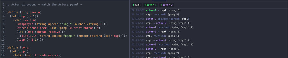 Gerbil Playground v1.2 adds an actor message log that makes concurrency visible: watch spawned threads exchange messages in real time. Plus ... embeddable mode for dropping live REPLs into documentation, a mobile layout, and resizable panes.